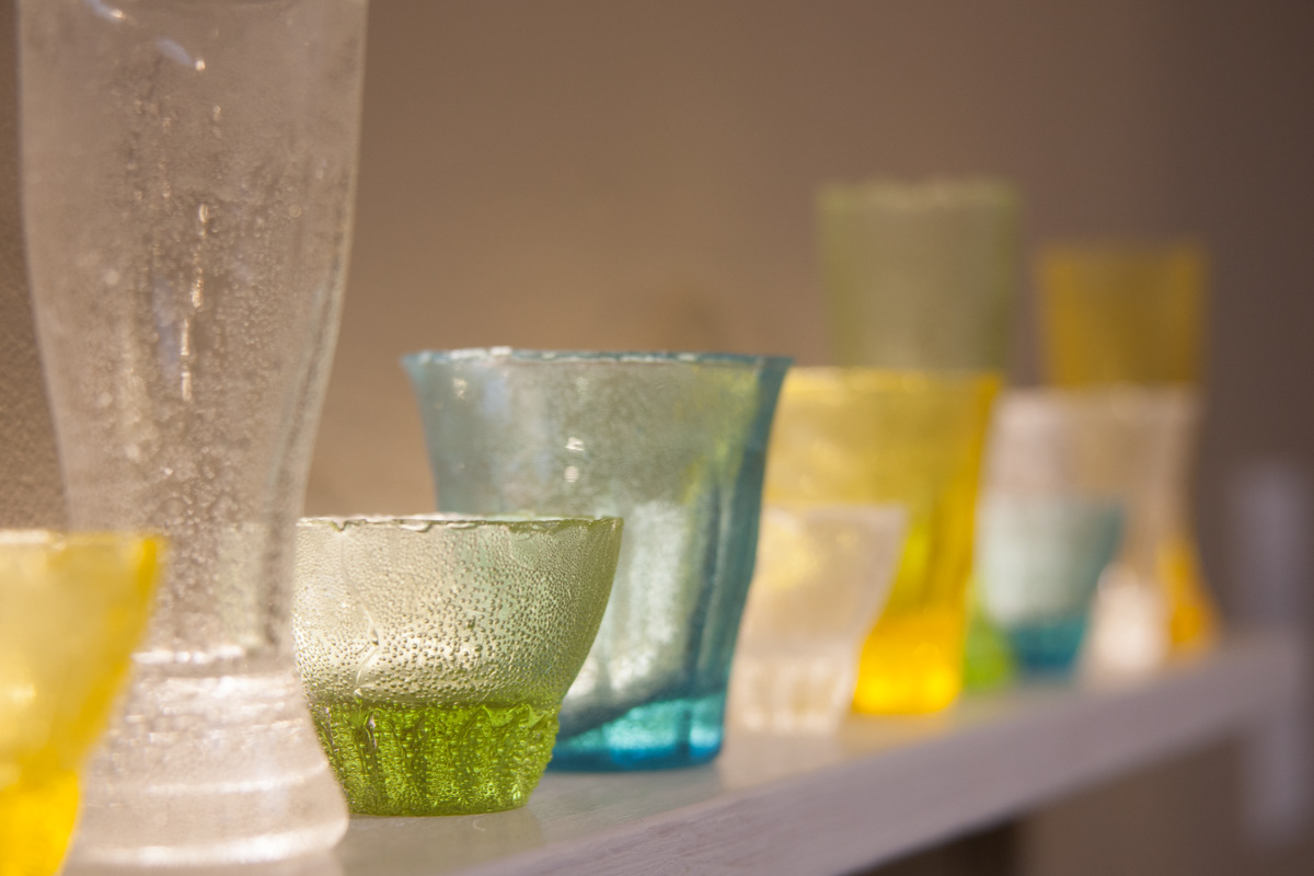 Cast isomalt, food coloring, shelving unit, light W72cm x D10cm x H13cm This artwork is presented as a part of a group exhibition, "Emancipation" at Soul Full Cup(Corning, NY). Sweet Vessels is an ongoing investigation of the material and aesthetic properties of sugar glass, commonly known as hard candy. The work consists of a series involves of installations of goblets cast out of sugar glass. When the goblets are freshly produced, they look and feel like real glass. However, over time the goblets transform, changing in shape, color, and size as they melt and recrystallize in response to changing environmental conditions. The transformation of the sugar glass dramatizes the properties of glass itself as an amorphous solid. The installation educates the audience in the science of amorphous solids and challenges their conceptions of time, permanence, and materiality as what initially appears solid and durable is revealed to be fluid and in constant metamorphosis.